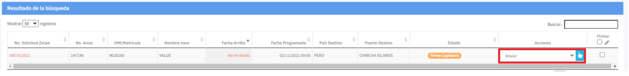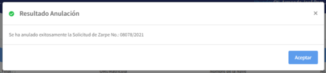 Para anular una solicitud de Zarpe, diríjase al listado de solicitudes, en la columna acciones, seleccione la opción "Anular" y de clic en el icono representado por una mano.