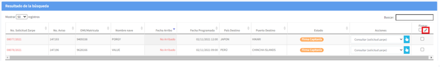 1. Diríjase al listado de solicitudes, y en la columna "Firmar", seleccione las solicitudes que desee aprobar. Finalice dando clic en el icono representado por un lápiz.