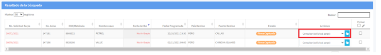 2. Diríjase al listado de solicitudes, en la columna acciones seleccione la opción "Consultar" , y de clic en el icono representado por una mano.