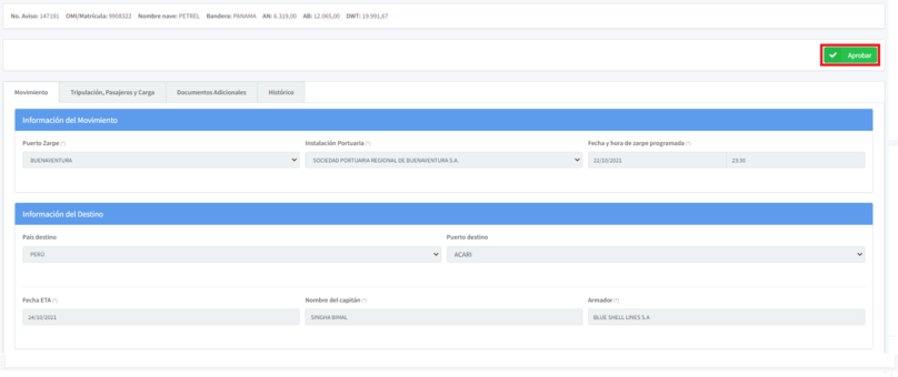 El sistema le mostrara el formulario de solicitud de Zarpe, con toda la información que registro la agencia. En la parte superior de la pantalla encontrara el botón "Aprobar". De clic en el botón correspondiente.