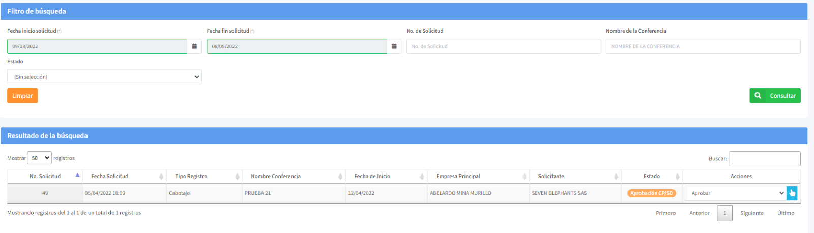 Para realizar la aprobación de Conferencias Marítimas, en la opción de Transporte del menú principal el sistema le mostrará un resumen de las solicitudes de Conferencias Marítimas que están pendientes por aprobar. Usted puede a través de la grilla, buscar aquellas Conferencias Marítimas que se encuentren en estado "Aprobación CP/SD ", seleccione la opción Consultar de la columna acciones y de clic en el icono representado por una mano.