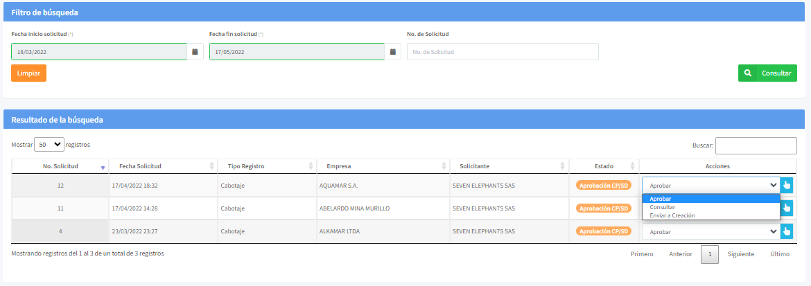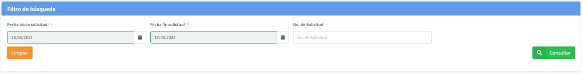 Una vez seleccionados los criterios de búsqueda, de clic en el botón "Consultar”. Inmediatamente en la parte inferior de la pantalla, le aparecerán todos aquellos registros que cumplan con los parámetros de búsqueda asociados. Utilice el botón "Limpiar", para borrar los criterios de búsqueda seleccionados e iniciar otra consulta.