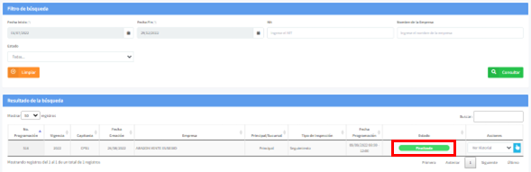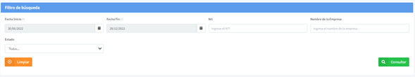 Una vez seleccionados los criterios de búsqueda, de clic en el botón "Consultar”. Inmediatamente en la parte inferior de la pantalla, le aparecerán todos aquellos registros que cumplan con los parámetros de búsqueda asociados. Utilice el botón "Limpiar", para borrar los criterios de búsqueda seleccionados e iniciar otra consulta.