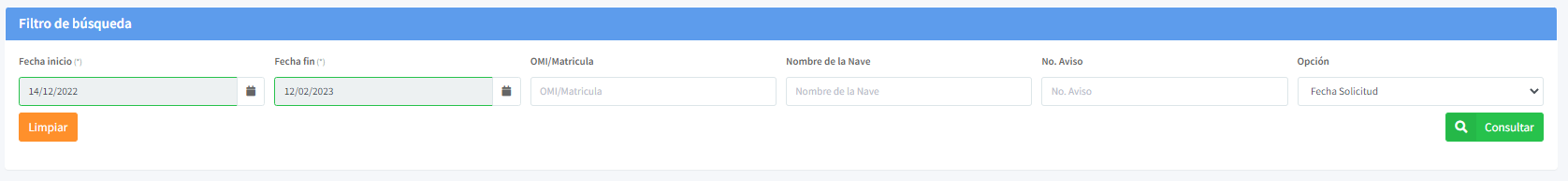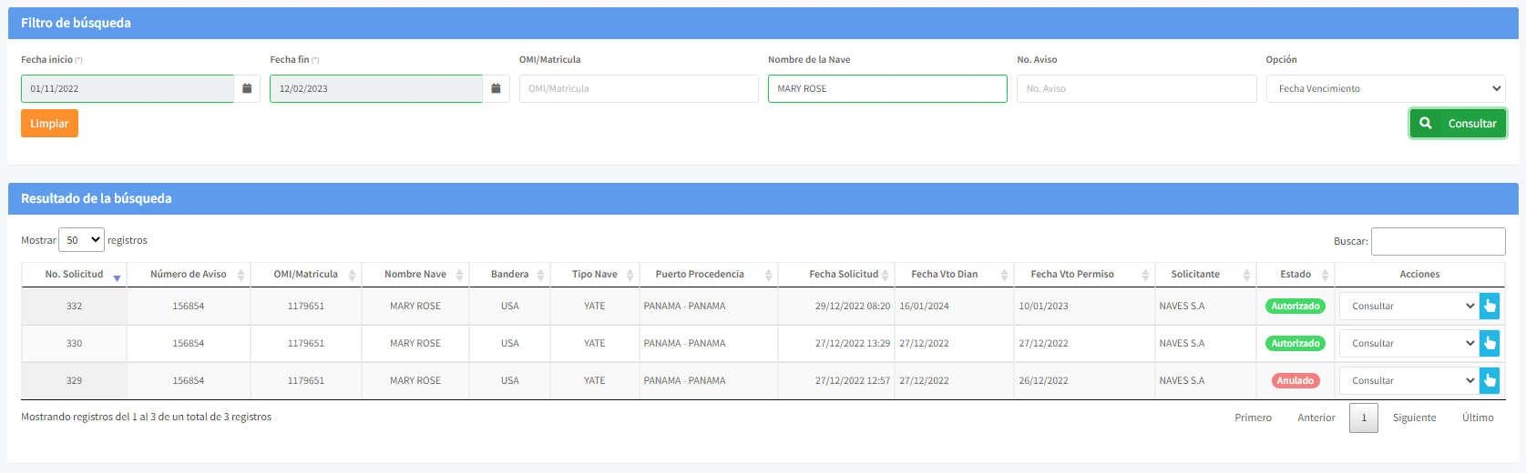 El módulo PP Yates y Veleros del sistema de Tráfico Internacional, Cuenta con unos parámetros que facilitan la búsqueda de solicitudes. Usted puede realizar la búsqueda por uno o mas criterios.