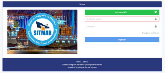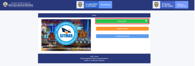 Para acceder al sistema Integrado de Tráfico y Transporte Marítimo , debe ingresar a la url https://app.dimar.mil.co/Sitmar que abrirá la pantalla de inicio con las siguientes opciones: