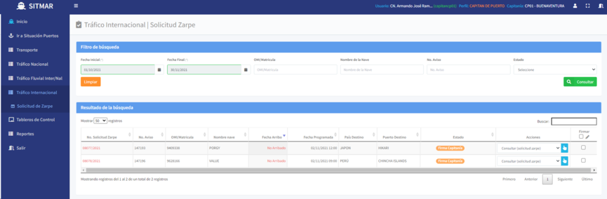 En la opción de Solicitudes de Zarpe del módulo Tráfico Internacional, Usted podrá: