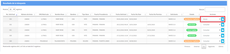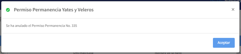 Para anular una solicitud de permiso de permanencia, diríjase al listado de solicitudes, en la columna acciones, seleccione la opción "Anular" y de clic en el icono representado por una mano.