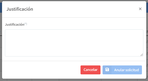 Ingrese la justificación y de clic en el botón "Anular Solicitud". Este botón no se activa hasta que no se ingrese la justificación. El sistema le mostrará un mensaje de confirmación indicando que se ha anulado la solicitud de forma exitosa