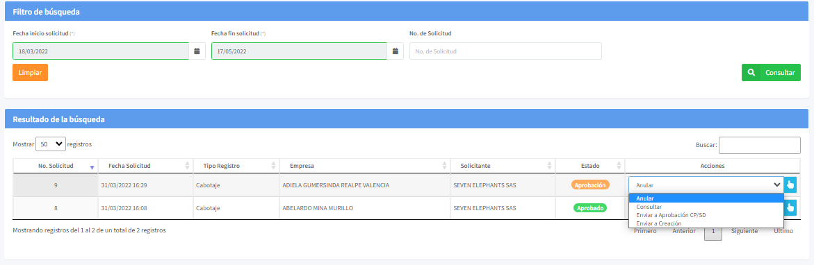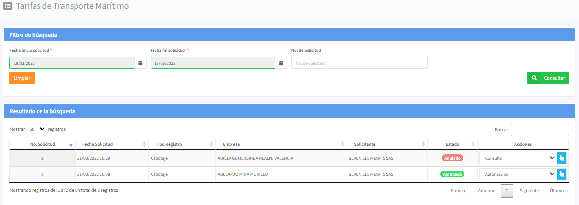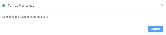 Las Tarifa de Transportes pueden ser anuladas cuando se encuentran en estado "Aprobación". Para anular una solicitud, diríjase a la columna acciones y seleccione la opción "Anular", finalice dando clic en el icono representado por una mano.