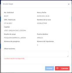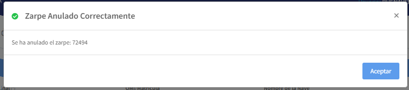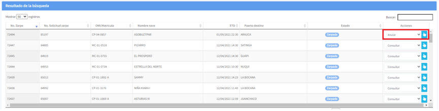 Para anular un Zarpe, ingrese por la opción "Administración de Zarpes". Diríjase al listado de Zarpes creados, en la columna acciones, seleccione la opción "Anular" y de clic en el icono representado por una mano.