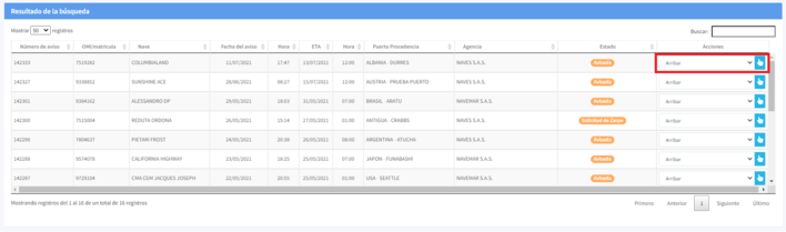 Para realizar un arribo, diríjase al listado de avisos de arribo que encuentra en la parte inferior de la pantalla principal de arribos. Seleccione la opción "Arribar", seguido de clic en el icono representado por una mano