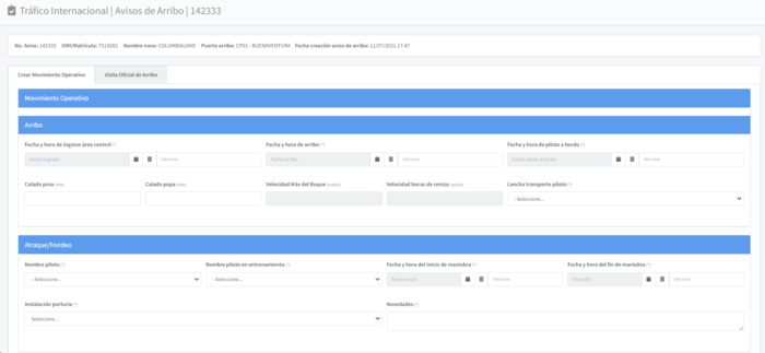 El sistema le mostrará un formulario para el trámite de arribo divido en dos partes: