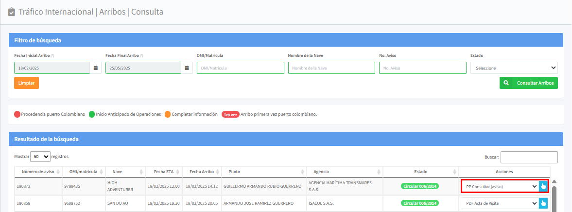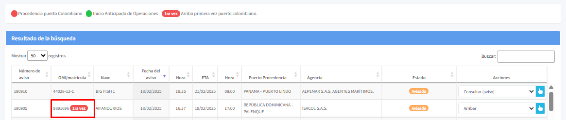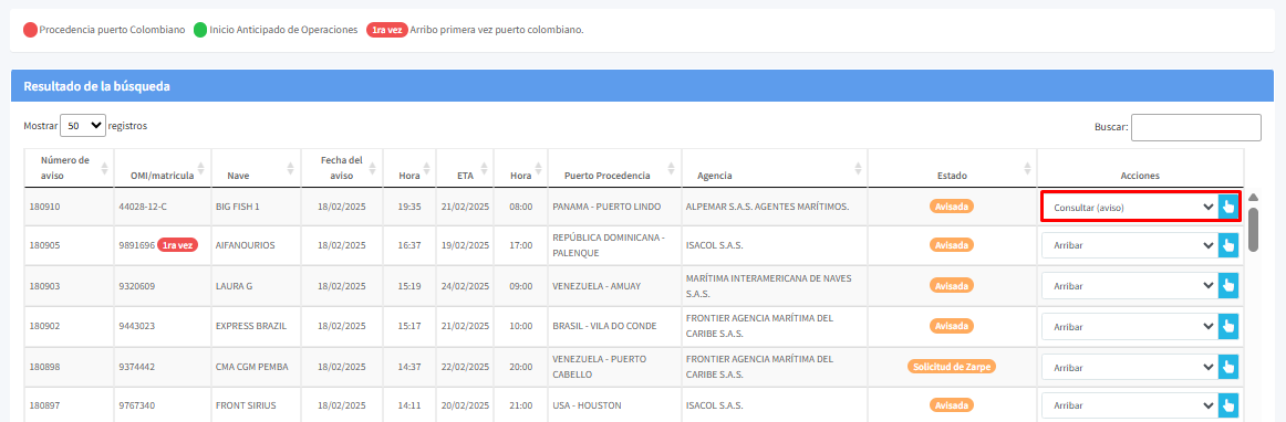 Al consultar avisos de arribo, en la parte superior del panel de Resultado de la búsqueda, encontrará las siguientes opciones que si aplican a la nave, se mostrarán en la columna de OMI/matricula: