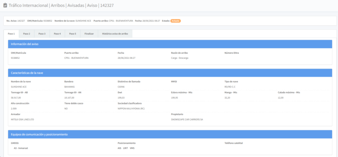 El sistema le mostrará la información completa de aviso de arribo, ingresada por la agencia. Esta información no podrá ser modificada.