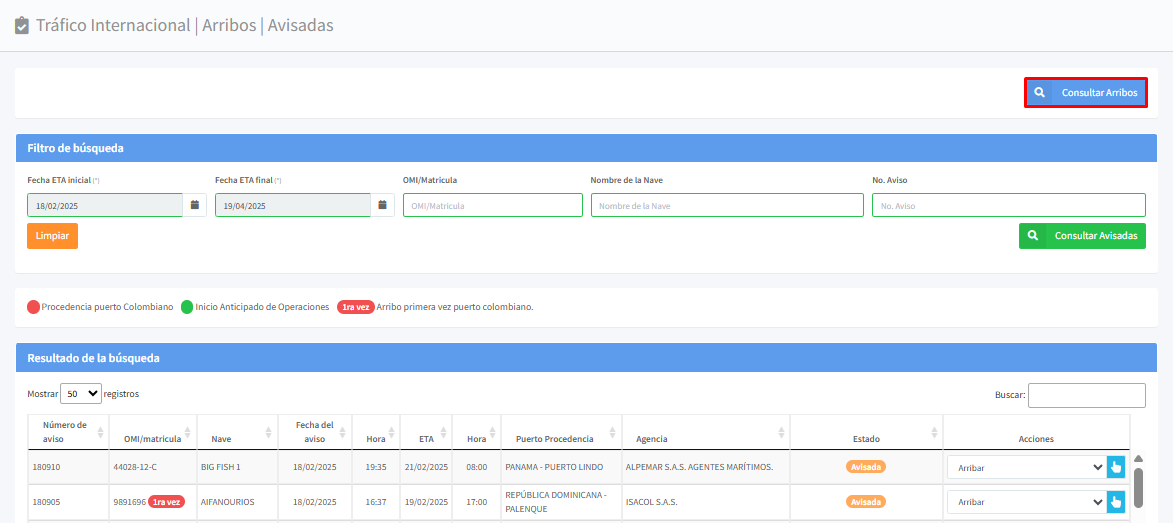 2. Cuando ya se realizo el arribo en el sistema: Diríjase al menú de arribo, y de clic en el botón "Consultar Arribos" de la parte superior de la pantalla