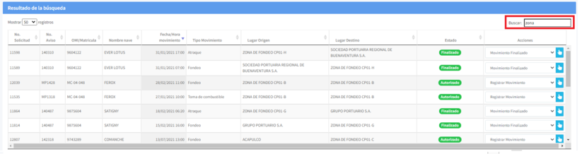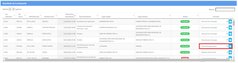 Para consultar un movimiento en especifico, diríjase al listado de solicitudes, seleccione la opción "Consultar Movimiento" o "Movimiento Finalizado" de la columna aciones y de clic en el icono representado por una mano.