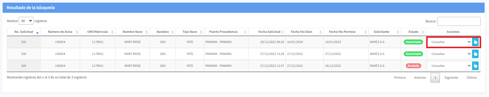 Para consultar una solicitud de permiso de permanencia en especifico, diríjase al listado de solicitudes, seleccione la opción "Consultar " de la columna acciones y de clic en el icono representado por una mano.