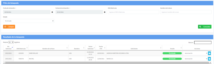 El módulo Permiso especial de Cabotaje, del sistema de transporte Marítimo nacional e intencional, cuenta con unos parámetros que facilitan la búsqueda de solicitudes. Usted puede realizar la búsqueda por uno o mas criterios.