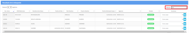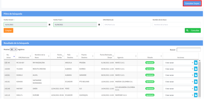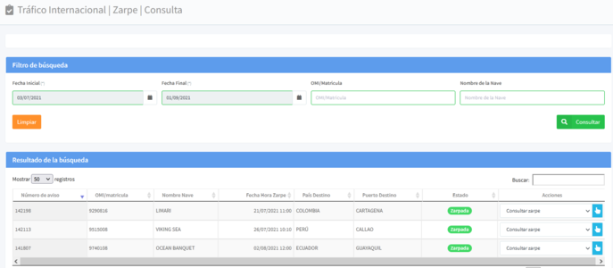 El sistema lo enviará a la ventana de Consulta de Zarpes. En la parte inferior de la pantalla encontrará el listado de Zarpes realizados.
