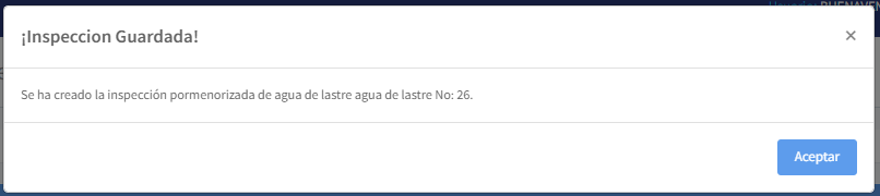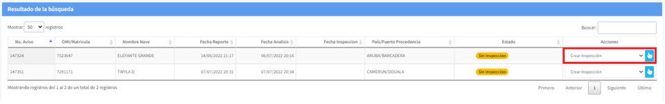 Para crear una inspección indicativa, revise el listado de análisis de reportes de agua de lastre que aparecen en la parte inferior de la pantalla. Cuando detecte el reporte al que le desea crear la inspección indicativa, diríjase a la columna acciones y seleccione la opción correspondiente. Finalice dando clic en el icono representado por una mano.