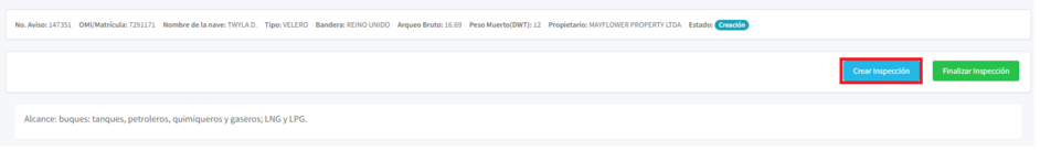 Una vez registrada toda la información, finalice la inspección indicativa dando clic en el botón "Crear Inspección" , que se encuentra en la parte superior de la pantalla