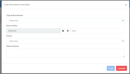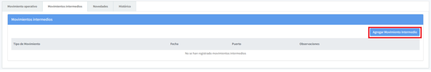Esta opción esta disponible, para que usted registre otros movimientos que hagan las naves entre trayectos. Para crear un movimiento intermedio, ingrese al Zarpe creado y, diríjase a la pestaña "Movimientos Intermedios", y de clic en el botón "Agregar Movimiento Intermedio"