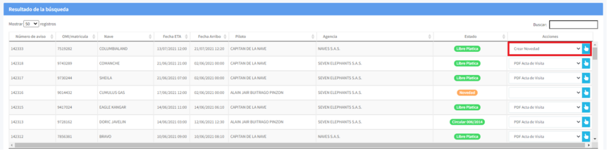 Para crear una novedad diríjase al listado de arribos que encuentra en la parte inferior de la pantalla seleccione la opción Crear Novedad de la columna acciones y de clic en el icono representado por una mano.