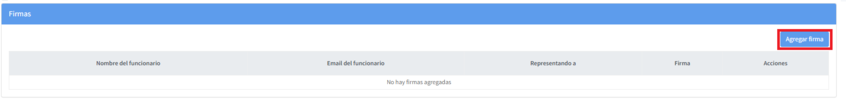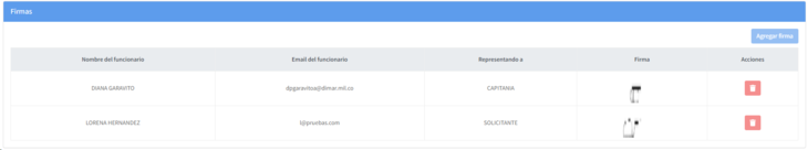 En el bloque firmas, quedarán todas las firmas ingresadas. En la columna acciones se activará el botón de eliminar por si desea repetir o quitar alguna firma.