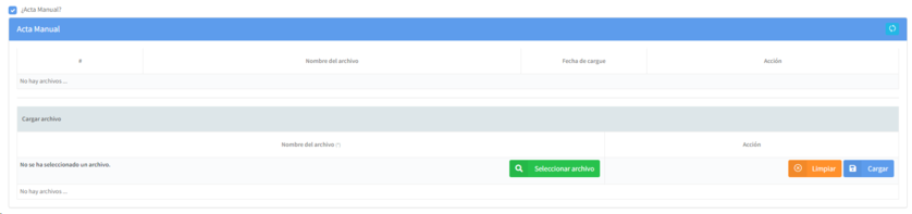 c. Acta Manual: En los casos en los que el acta se realce de forma manual, el sistema cuenta con una casilla que al seleccionarla, le habilitara la opción para que adjunte el acta realizada manualmente.
