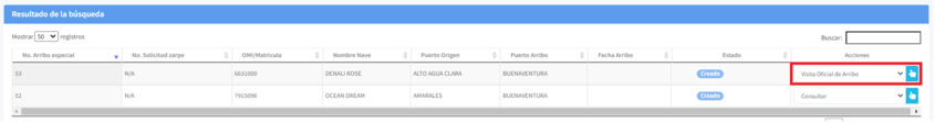El sistema le mostrará el listado completo de arribos especiales creados. Cuando el arribo especial se encuentre en estado Creado, diríjase a la columna acciones, seleccione la opción Visita Oficial de Arribo y de clic en el icono representado por una mano.