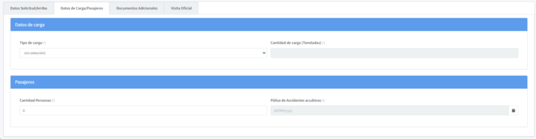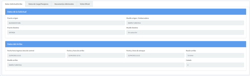 1. Datos de la solicitud: En esta pestaña usted encontrará la información de origen, destino, e información básica de la nave en modo lectura.