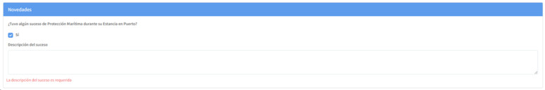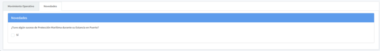 2. Novedades: En la pestaña novedades seleccione si la nave tuvo algún suceso de protección durante la estancia en el puerto.