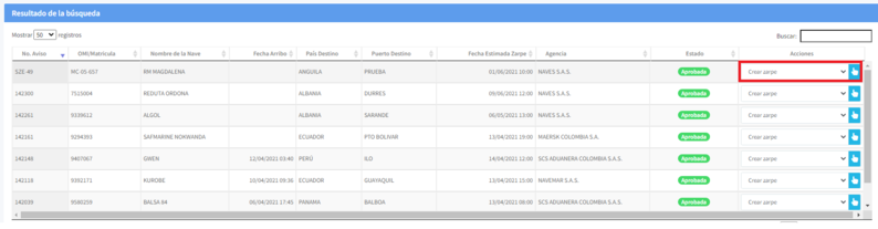 Para realizar el trámite de Zarpe, diríjase al listado de solicitudes de Zarpe que encuentra en la parte inferior de la pantalla. Una vez encuentre la solicitud a Zarpar, de clic en la opción "Crear Zarpe"