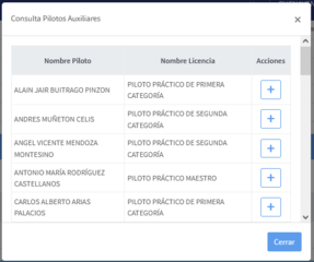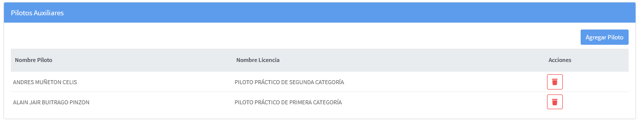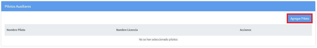 b. Pilotos Auxiliares: Para agregar un nuevo piloto asistente, de clic en el botón "Agregar Piloto"