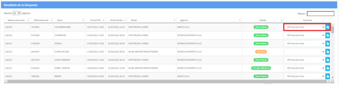 Para realizar la descarga del acta de visita, diríjase al listado de arribos que encuentra en la parte inferior de la pantalla. Cuando la solicitud se encuentre en estado "Libre Plática", de la columna acciones seleccione la opción PDF Acta de visita y de clic en el icono representado por una mano.