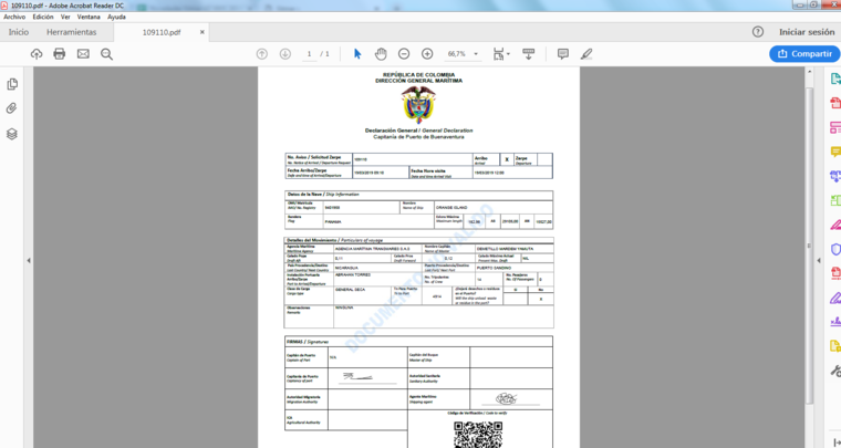 En caso que al escanear el código, le aparezca un mensaje, indicando que el documento no ha podido ser validado, por favor envie un correo a soportesitmar@dimar.mil.co, con el número de arribo indicado en el documento, para verificar su validez.