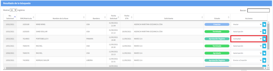 1. Revise el listado de permisos especiales de cabotaje que aparece en la parte inferior de la pantalla, seleccione la acción "Consultar" y de clic en el icono representado por una mano.