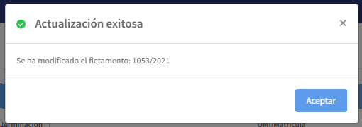 El sistema le mostrará un mensaje de confirmación, indicando que el permiso especial de cabotaje ha sido modificado y queda en estado "Aprobación Ditra"