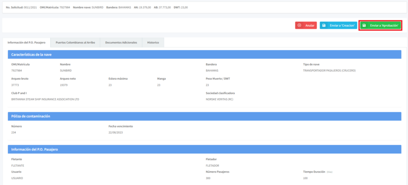 El sistema lo enviará al formulario de permiso ocasional de pasajeros que creo la agencia. En la parte superior de la pantalla se encuentra el botón "Enviar a Aprobación". De clic en el botón correspondiente.