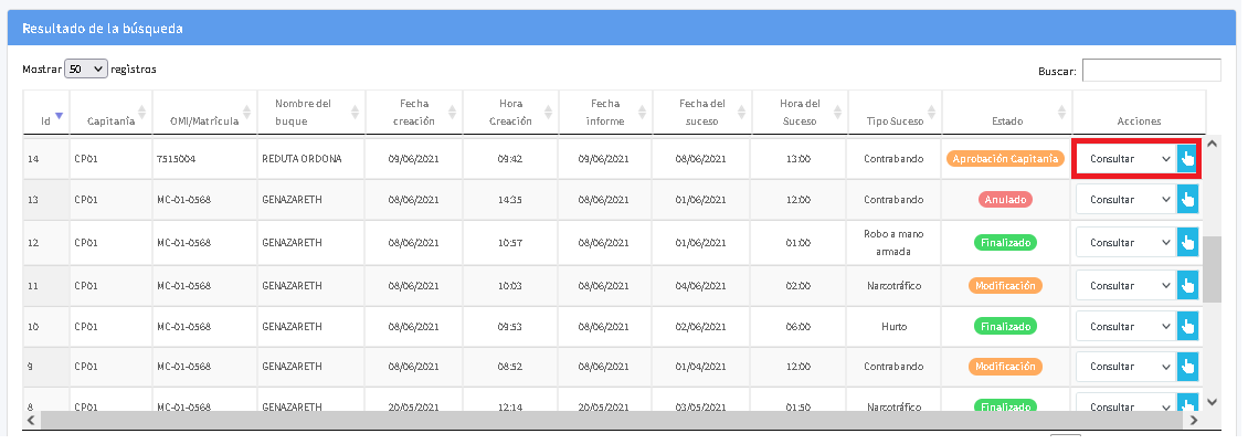Para Enviar a aprobación los sucesos de protección, busque aquellos sucesos que se encuentren en estado "Aprobación Capitanía", seleccione la opción Consultar de la columna acciones y de clic en el icono representado por una mano.