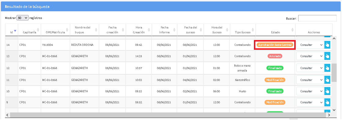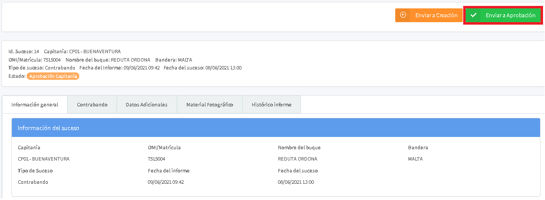 Al consultar en la ventana principal, el suceso de protección quedará en estado "Aprobación Capitanía"