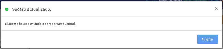 El sistema mostrará un mensaje de confirmación, indicando que el suceso de protección fue enviado para aprobación de sede central.