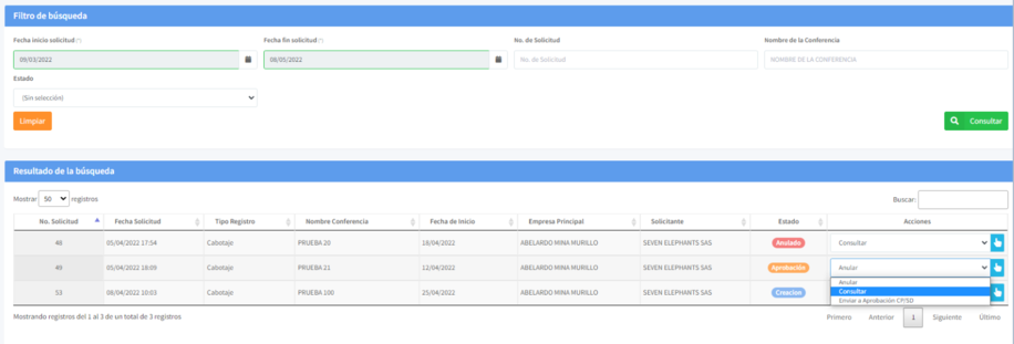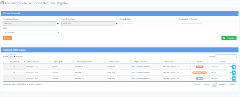 Para enviar a Firma de Capitán las Conferencia Marítimas, revise el listado de solicitudes que aparece en la parte inferior de la pantalla. Cuando detecte la solicitud que desea enviar a firma del capitán diríjase a la opción “Consultar" que encuentra en la columna acciones. Usted podrá enviar a Firma de capitán, solo aquellas solicitudes que se encuentran en estado "Aprobación"