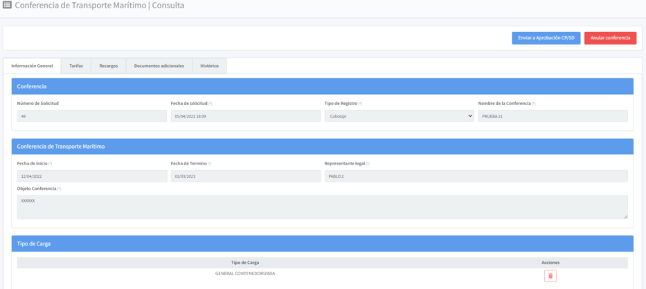 El sistema abrirá la Conferencia Marítima creado por la empresa de transporte o agencia marítima. De clic en el botón "Enviar a Aprobación SP/SD" que encuentra en la parte superior de la pantalla.