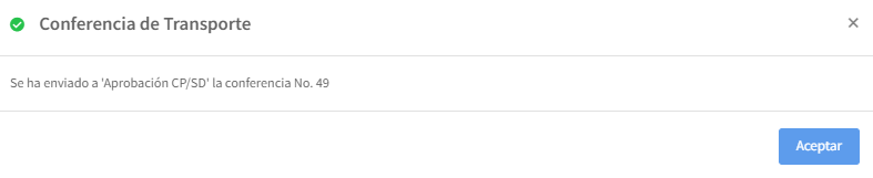 El sistema mostrará un mensaje de confirmación, indicando que la Conferencia Marítima fue enviado para aprobación de la capitanía o sede central según el tipo de empresa.
