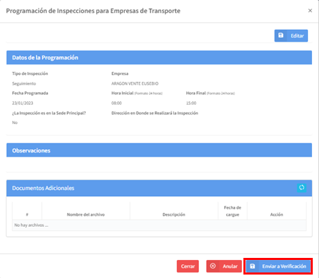 El sistema le mostrará una ventana para Enviar a verificación la programación.