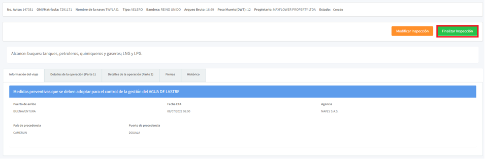 El sistema le mostrará el formulario de inspección Indicativa. Para finalizar de clic en el botón "Finalizar Inspección"