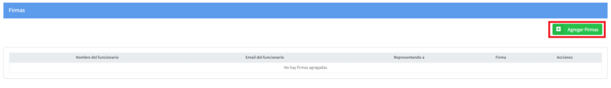 Firmas: Para agregar firmas, de clic en el botón "Agregar Firmas"