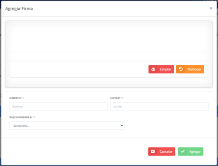 El sistema le mostrará una ventana para que agregue todas aquellas firmas requeridas. Ingrese la firma en el panel de firmas, registre la información (Nombre, Correo y Representado a), y de clic en el botón "agregar". Los campos marcados con * son obligatorios.
