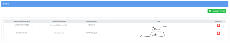 En el bloque firmas, quedarán todas las firmas ingresadas. En la columna acciones se activará el botón de eliminar por si desea repetir o quitar alguna firma.
